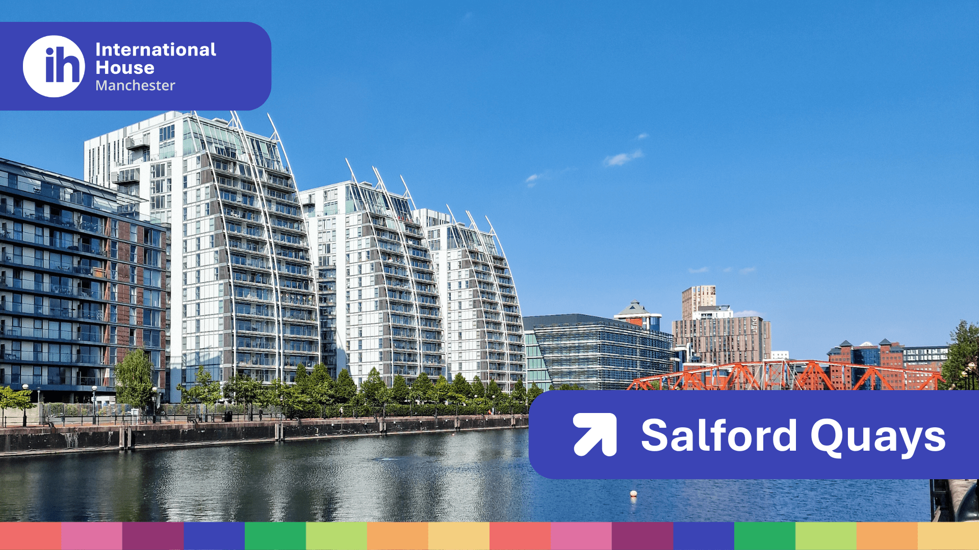 Salford Quays is a great place for a walk. The paths along the water are clean and safe. You can see modern bridges, colourful buildings, and reflections in the water. On sunny days, many people come to take photos. There are also public art pieces to discover. In the distance, you can see the Old Trafford football stadium, home to Manchester United.